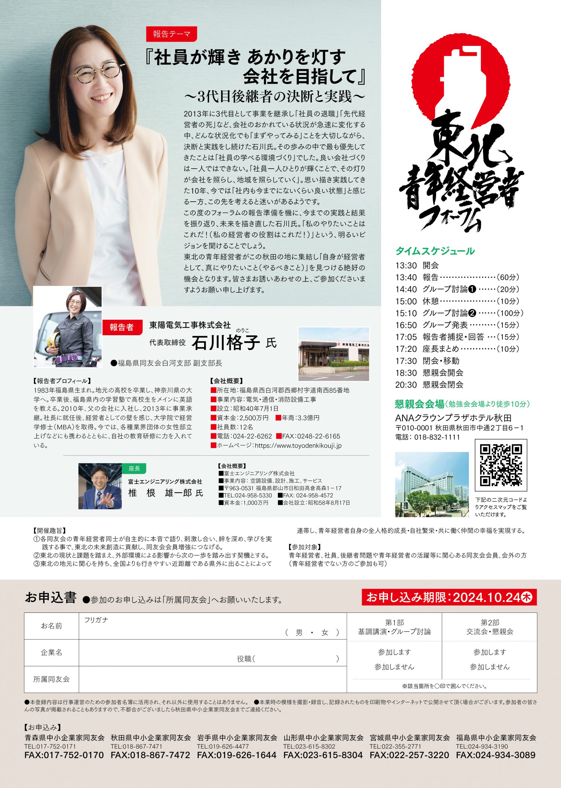 この度のフォーラムの報告準備を機に、今までの実践と結果を振り返り、未来を描き直した石川氏。「私のやりたいことはこれだ!(私の経営者の役割はこれだ!)」という、明るいビジョンを聞けることでしょう。東北の青年経営者がこの秋田の地に集結し「自身が経営者として、真にやりたいこと(やるべきこと)」を見つける絶好の機会となります。皆さまお誘いあわせの上、ご参加くださいますようお願い申し上げます。